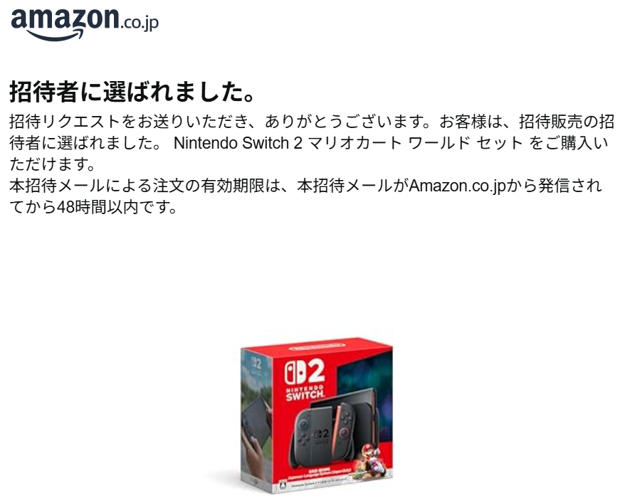 当選通知は、ほぼすべてメールで届きますから、私は最初の「switch2落選メール」から、その時間前後をメールチェックの時間としました。期限内に手続きを完了しないと当選が無効になることもあるので、スピード対応できる環境は整えておきましょう。
